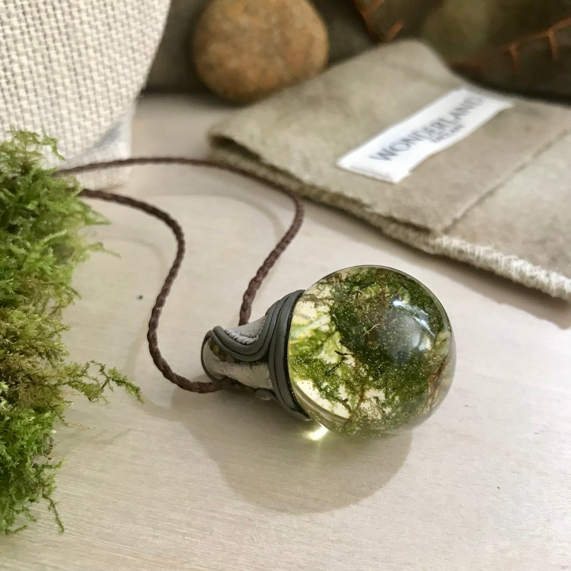 Forest moss has been set into clear resin and polished into a glowing sphere. Creating a tiny world of fairy magic ~ suspended in time. It is finished with one of my unique hand sculpted decorative caps and sits on an adjustable dark brown plaited cord. These necklaces are unique, durable and light to wear.