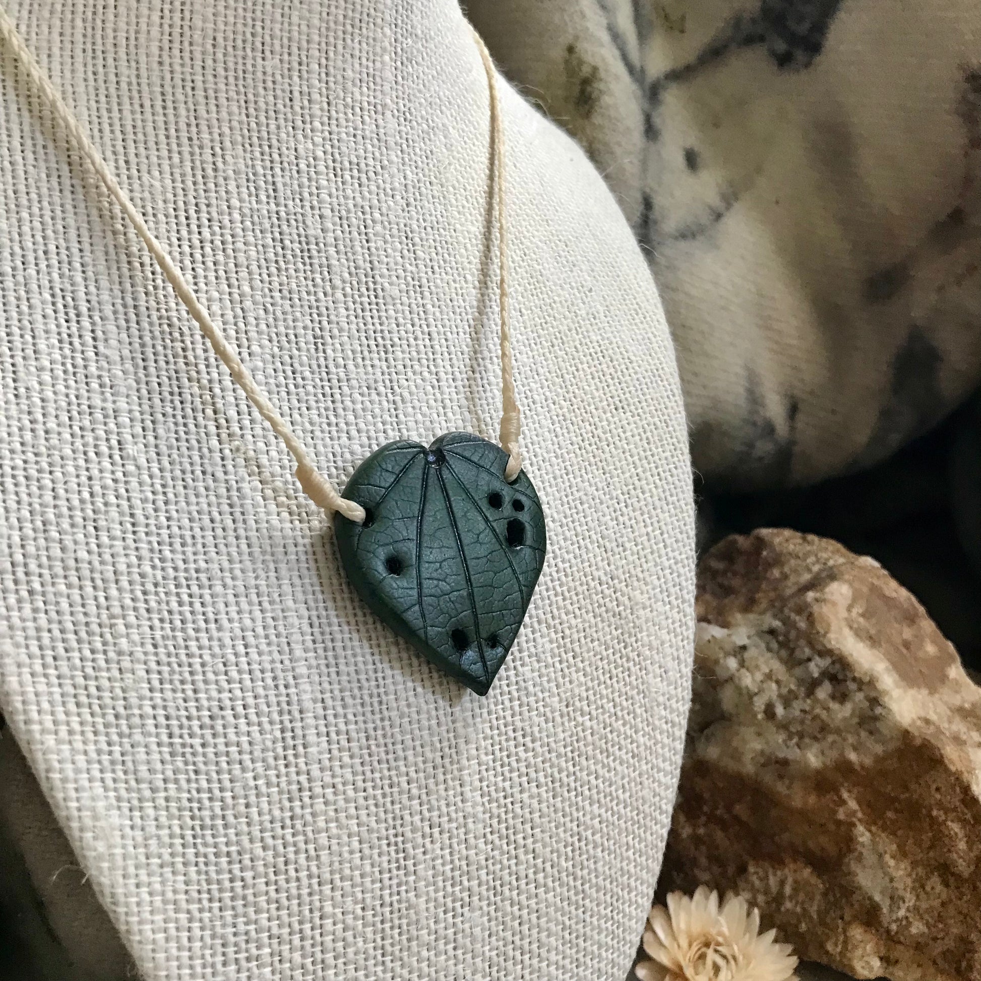 Each one of these beautiful Kawakawa leaf necklaces are unique, individually hand sculpted from modelling clay. Just as in nature, no two leaves are exactly the same. This necklace is finished with a plaited creme cord. It is durable, lightweight and easy to wear.