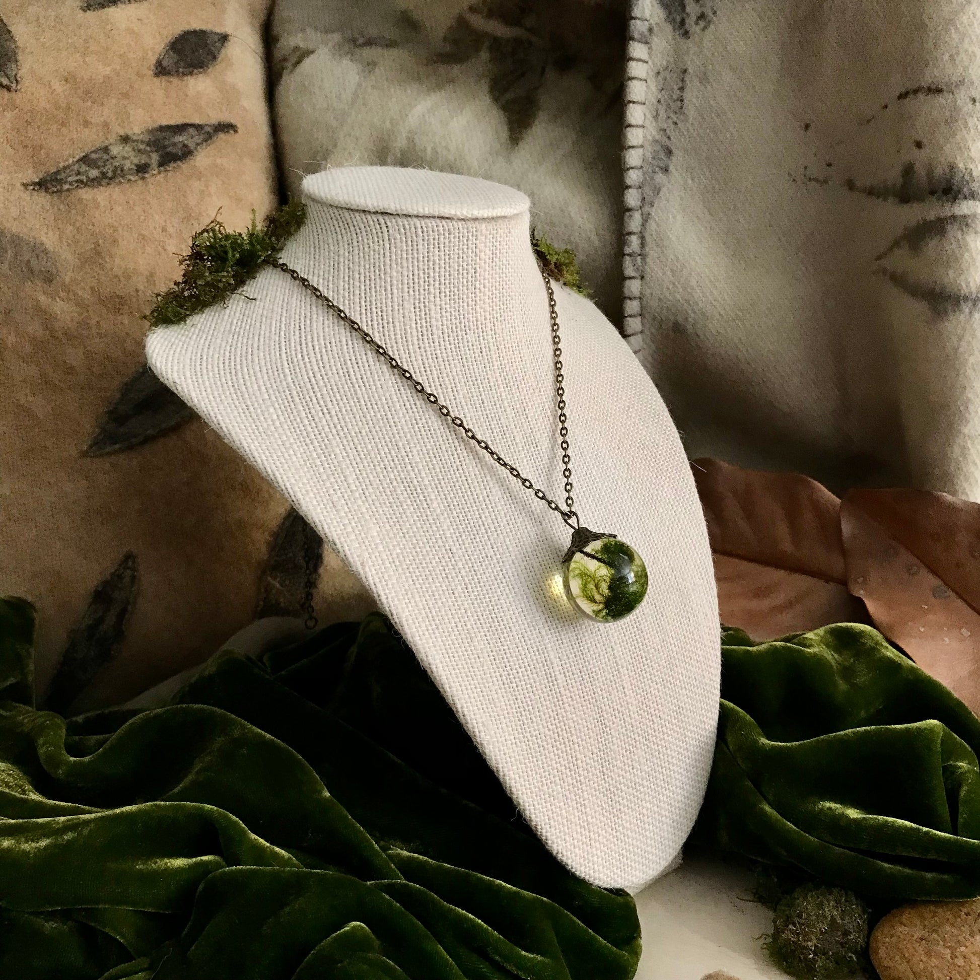 Forest moss has been set into clear resin to create a tiny world of magic... suspended in time. Beautiful reflections of the forest to carry with you.